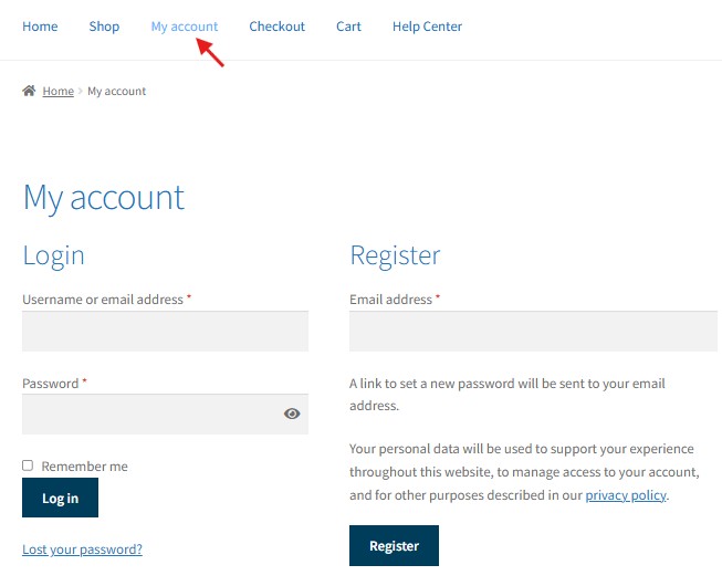 On the navigation menu, look for “My Account” and click it. Choose Login if you already have an account with us or Register to create your account.